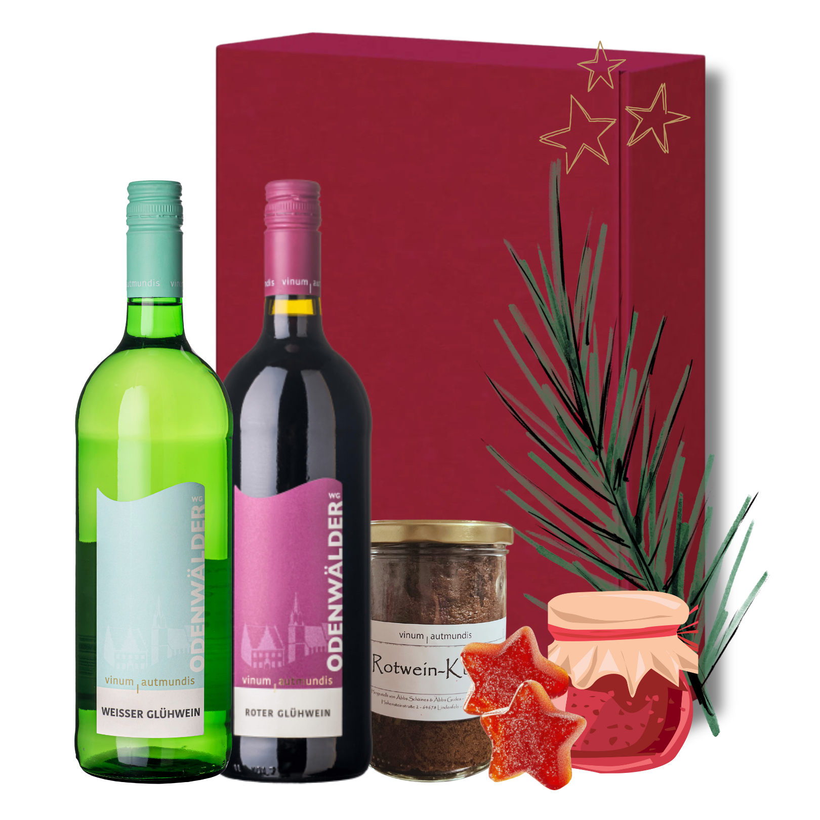 Dieses Paket vereint feine Glühweinspezialitäten und süße Köstlichkeiten – von Rotem und Weißem Glühwein über Rotweinkuchen bis hin zu Glühweingelee und Sternchen. Für gemütliche Genussmomente oder als liebevolles Geschenk in der Adventszeit. ✨ Inhalt: Nr. 13 Roter Glühwein, Nr. 15 Weißer Glühwein, Rotweinkuchen im Glas, Glühweingelee und Glühweinsternchen.